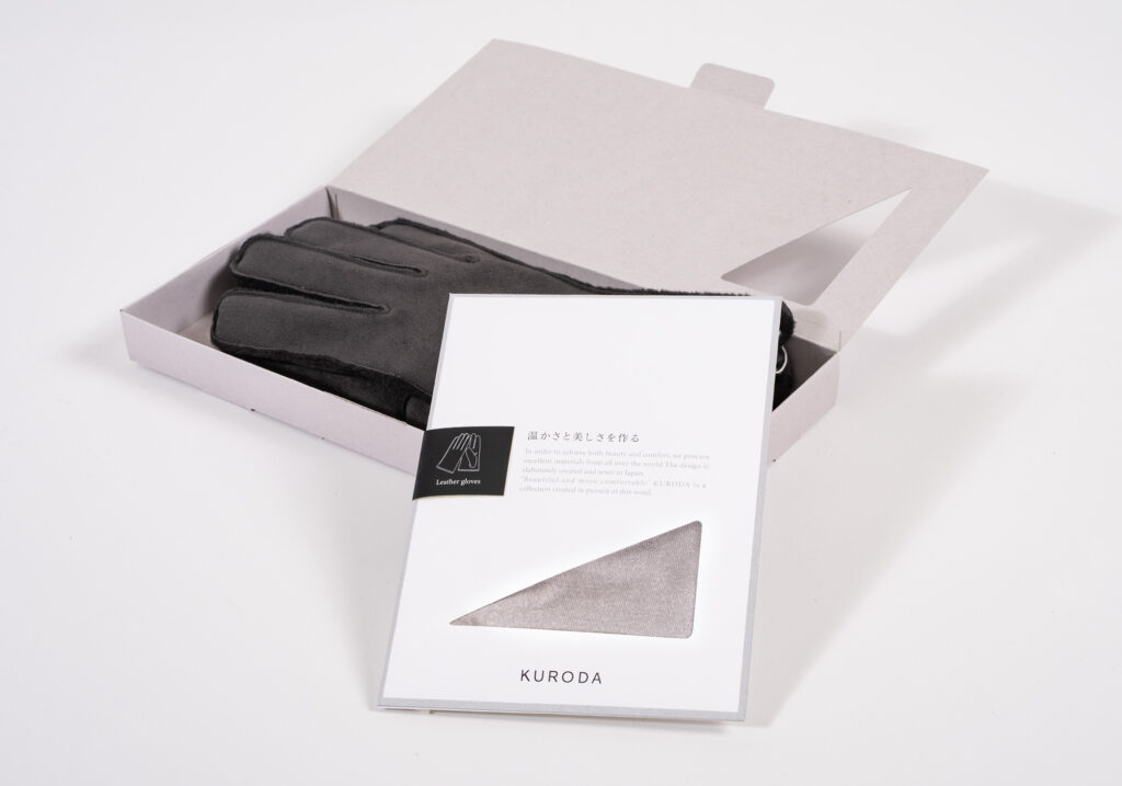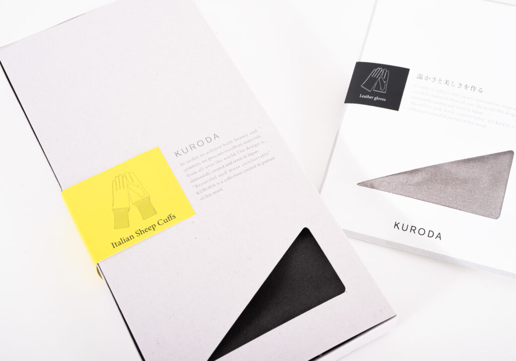 革手袋などのギフト需要が高い商品は高級感のあるケース型、日常使いのUV手袋などは手に取りやすい封筒型を採用し、さらに手袋の形状ごとに色分けしたシールを貼ることで、中身が直感的に判別できる利便性も追求しています。